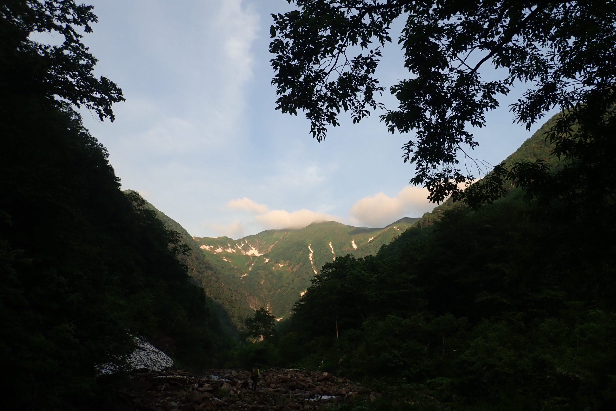 出合でキャンプ。太陽光パネルのLEDランタンは軽くていいね。翌日は早朝出発。この日も途中までは沢を詰めます。