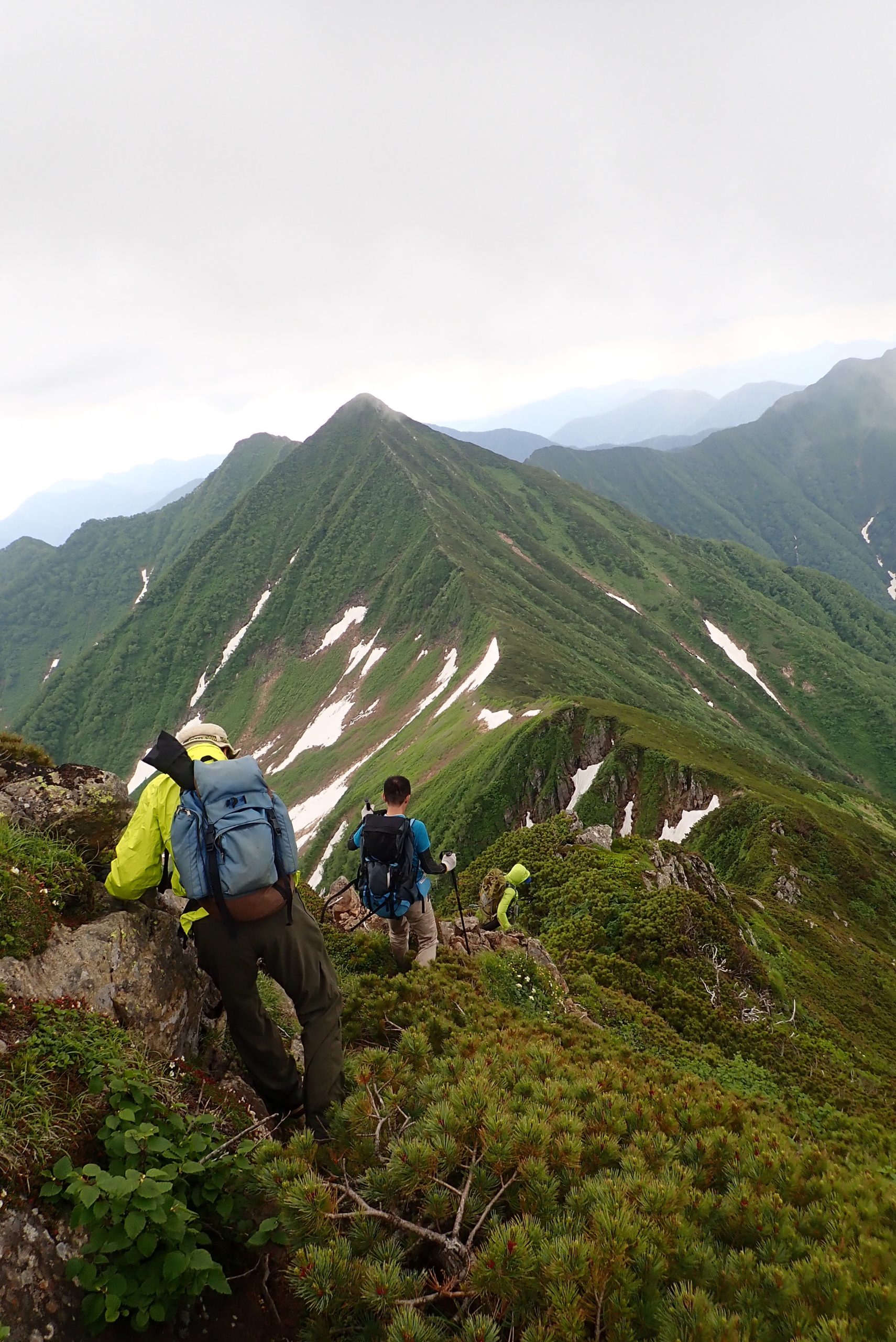 ガスが抜けるのを待ってはいたいが、帰りも長い!後ろ髪引かれながら下山開始。綺麗なピラミッドピークをみながら。うーん、ガス抜けてきてる?