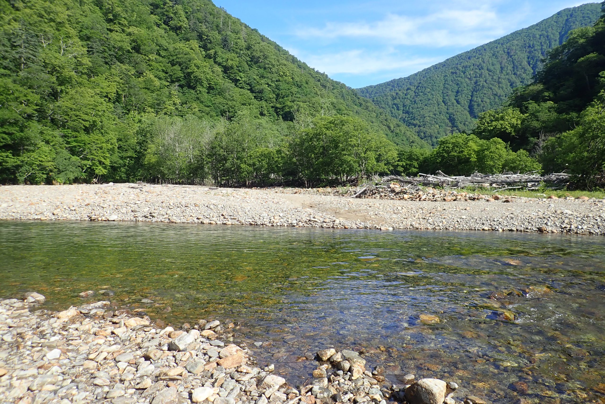 ずっと天気のイマイチだった北海道。そして前日に大雨予報。。。天気は良くなるけど渡渉があるので行けるのか?そんな心配をしながらスタート。林道歩いて渡渉点へ。