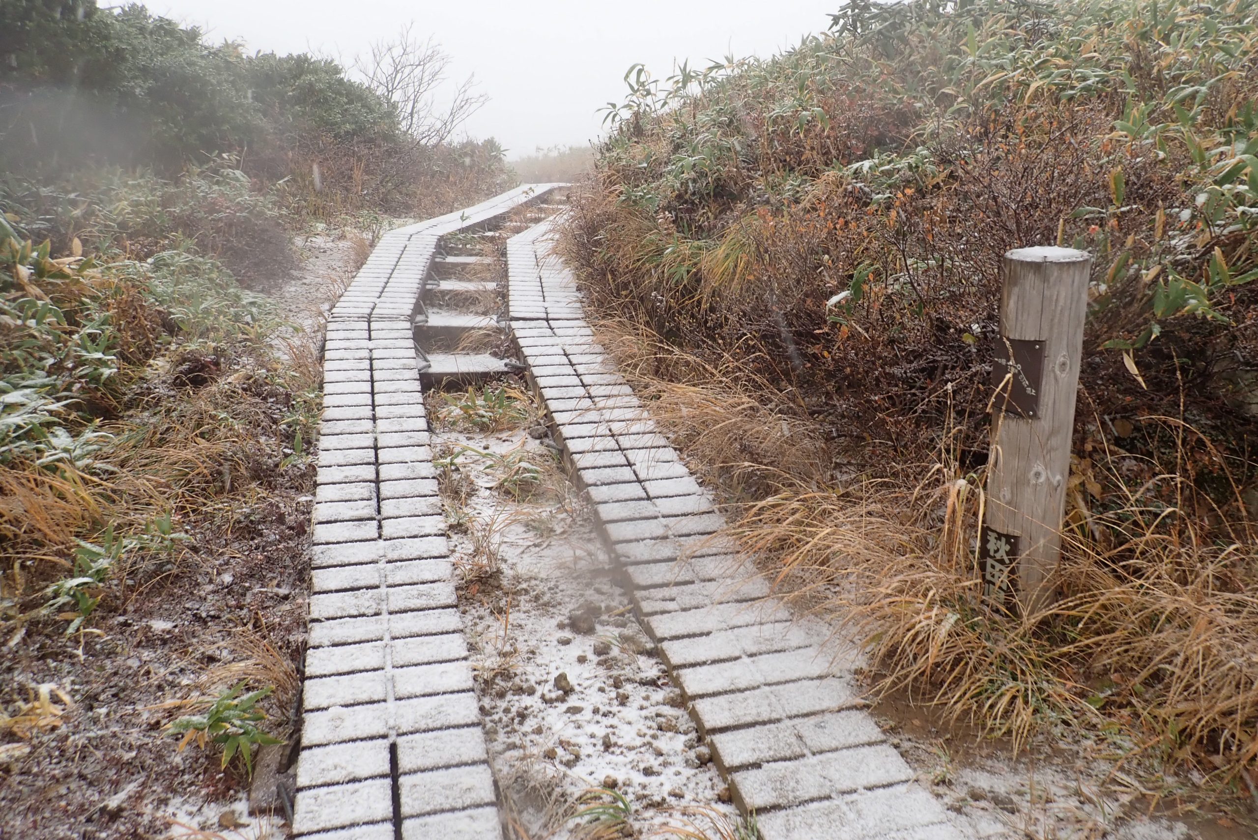 なんてこった!山頂で雪。しかも大粒。積もりそう。木道ヤバイ!