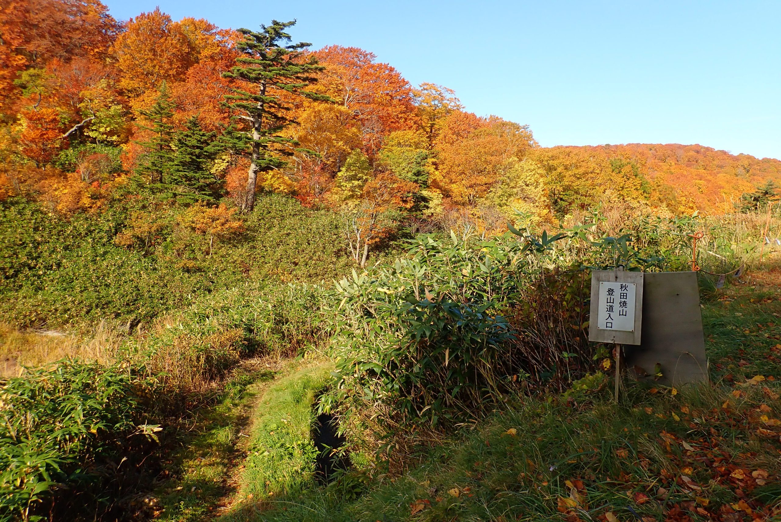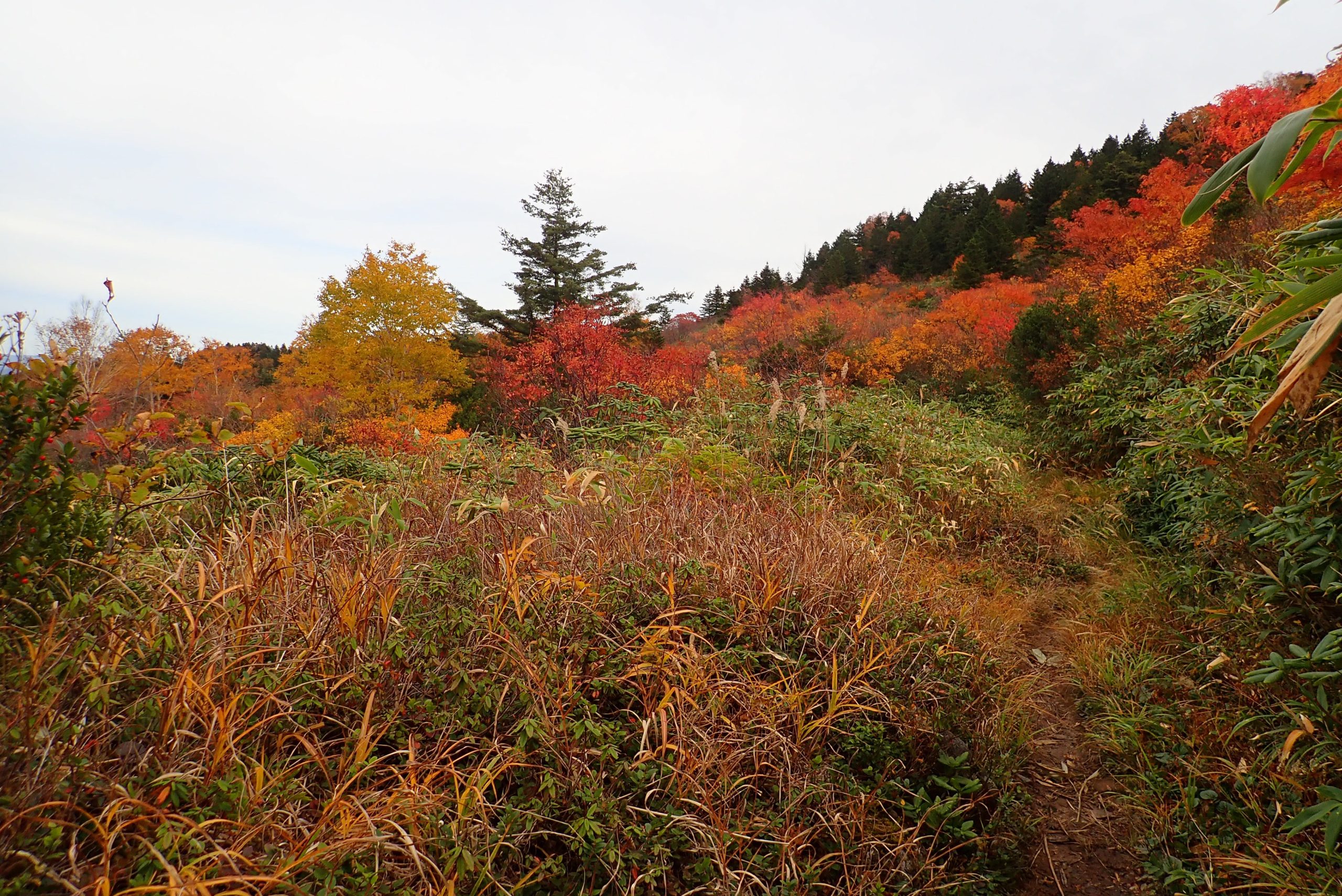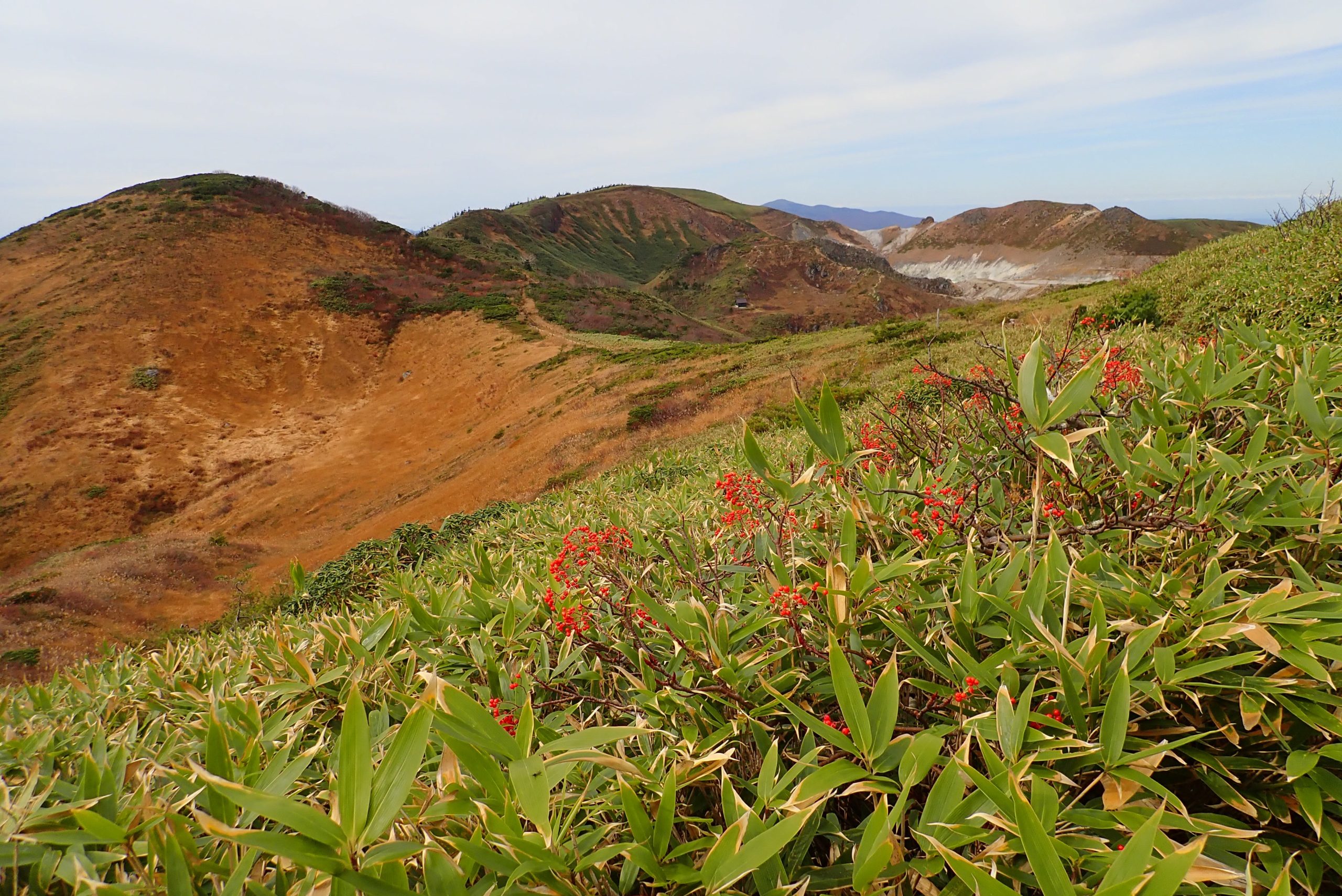 草紅葉と火山の火口、そして笹原。奥に見えるのは昨日の森吉山。