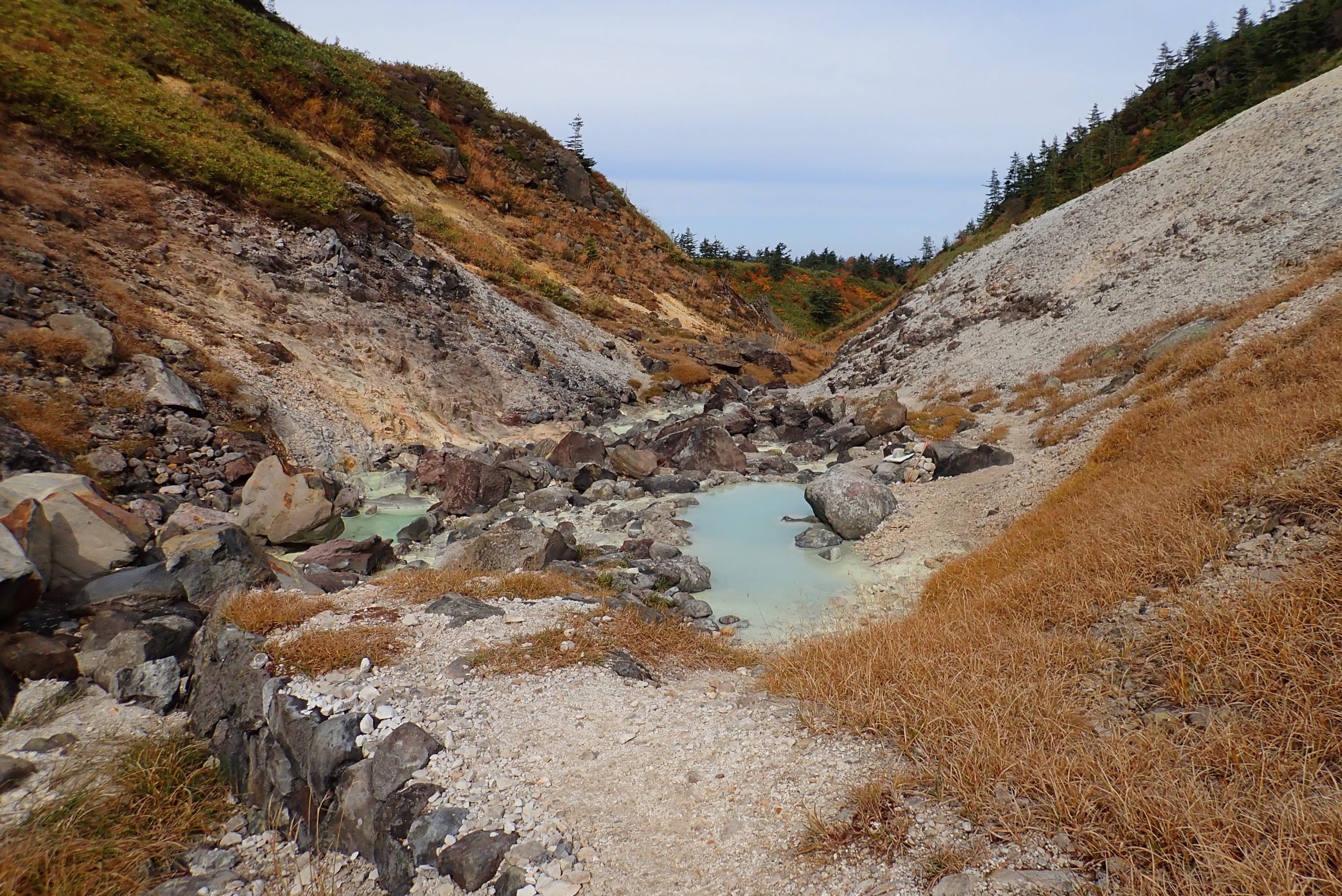 火口を上から反対側へ周り、行きとは違う沢沿いに。