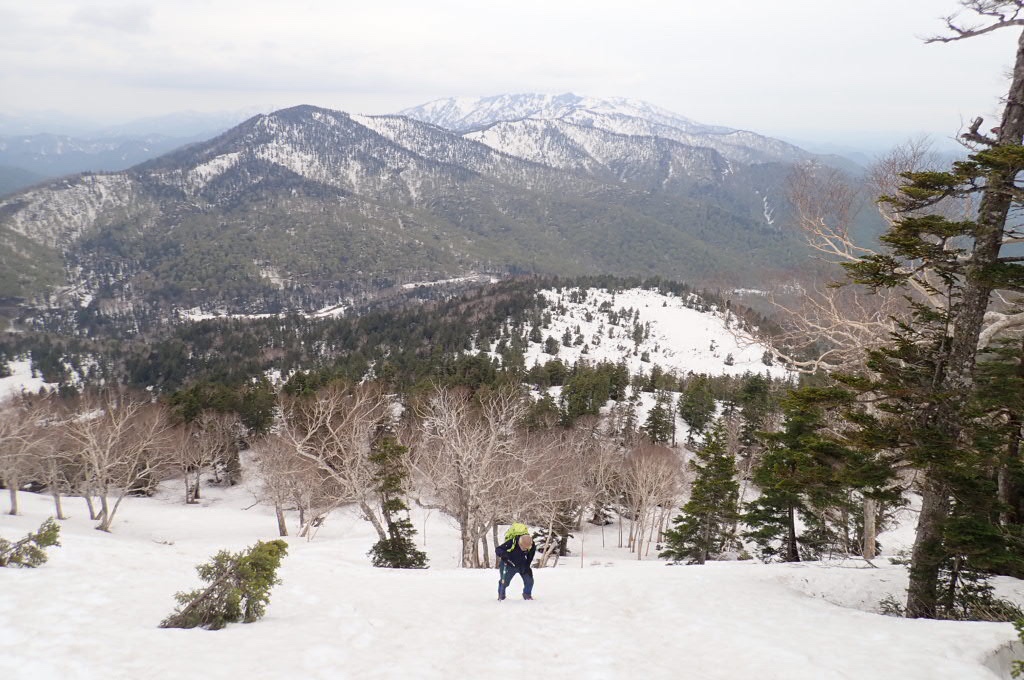 下りは程よく雪が緩み下りやすい。ここならトレース外しての尻セードも、し放題?最近、トレース潰す人もいる様だけど登りの事考えて欲しいですね。