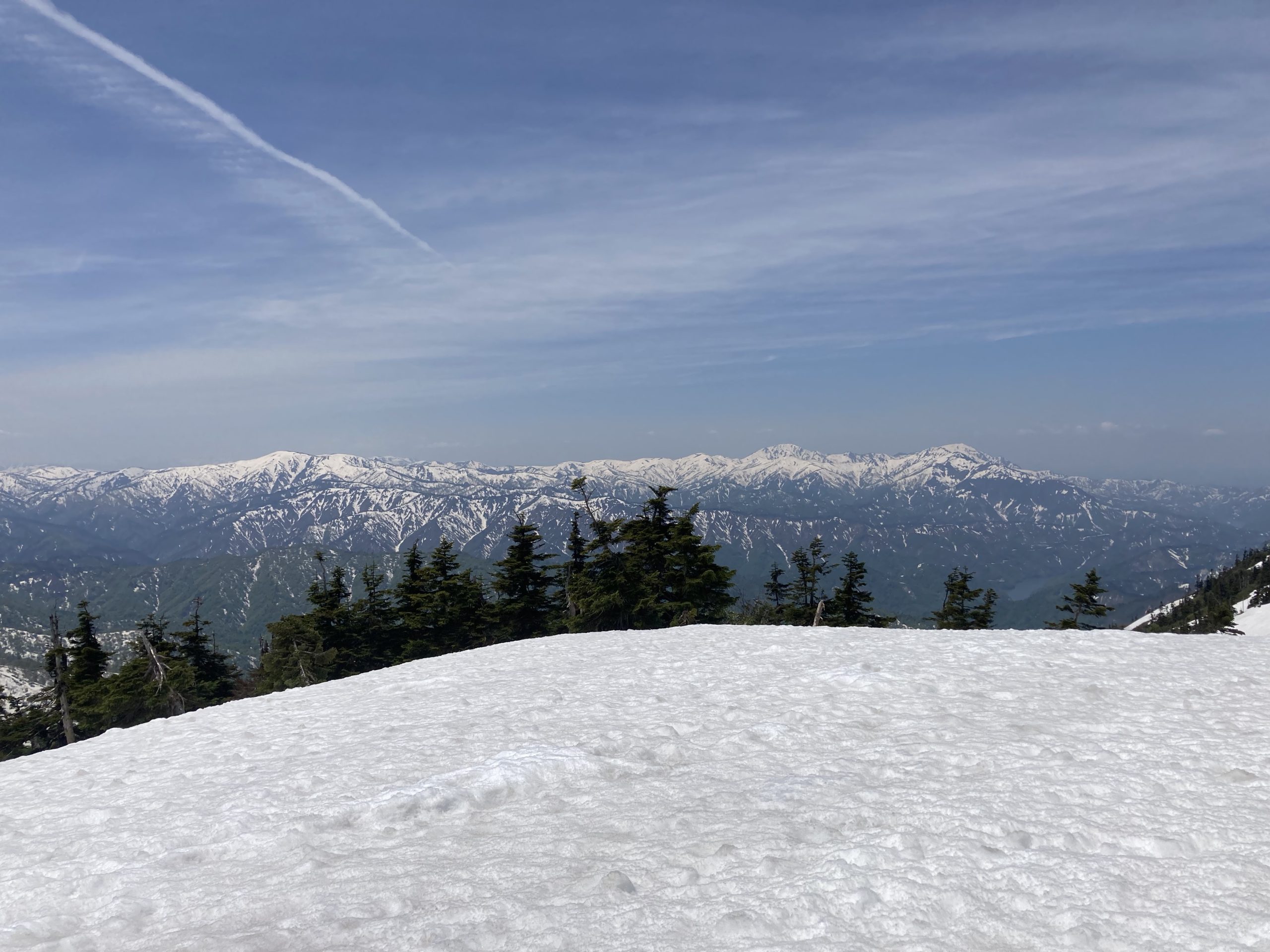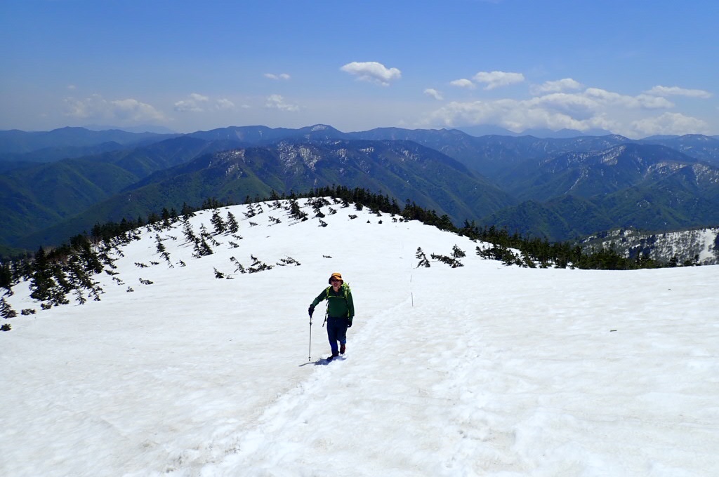 奥には越後の山々。去年、友達と行った荒沢ー中の岳ー越後駒も見える。