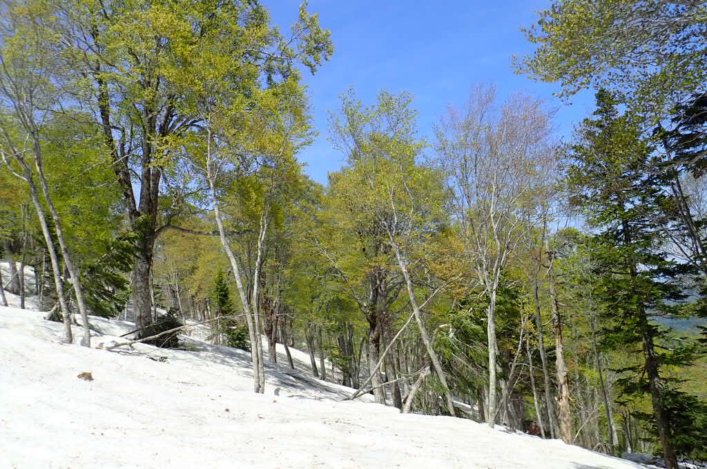 ブナの新緑が綺麗〜、まだ隣の沢は滑れそう〜♪
